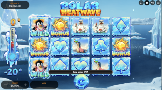 The game has four low-value symbols represented by card suites. Mid-value symbols are a seagull and a seal, while the highest-value symbol is a polar bear. The penguin is the game’s wild, replacing all other symbols in a winning combination bar the bonus symbol.